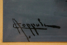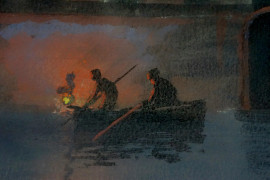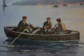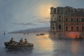 Notturno con pescatori di fronte a Palazzo Donn'Anna, tempera su carta, cm 32x59, firmato A. Coppola, entro cornice.