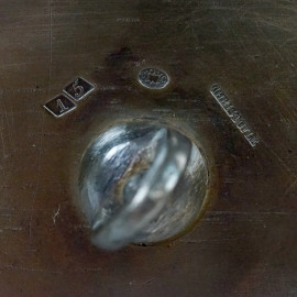 Oliera Christofle, XIX secolo, in metallo argentato, con due ampolle in vetro, cm 29,5x25,5x13, (tappi non pertinenti)