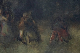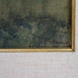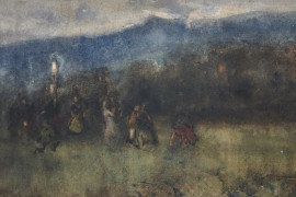 Paesaggio con figure, acquarello su carta, cm 21x31, firmato in basso a destra, entro cornice.