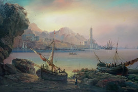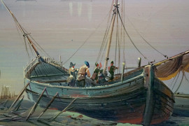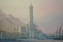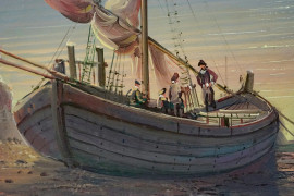 Paesaggio costiero con faro ed imbarcazioni, olio su tela, cm 80x120, XX secolo, entro cornice.
