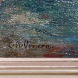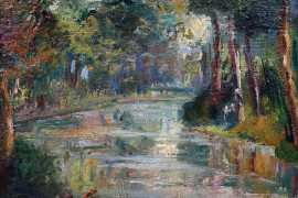 Paesaggio fluviale, olio su cartone, cm 22x27, firmato, entro cornice.