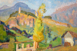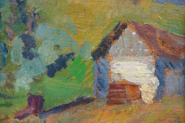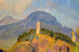 Paesaggio montano, olio su tavoletta, cm 23x32, firmato, entro cornice.