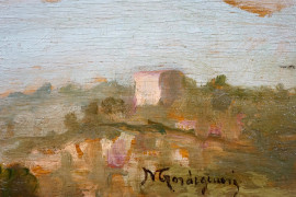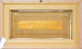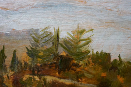 Paesaggio, olio su tavoletta, cm 10x28, firmato, entro cornice.