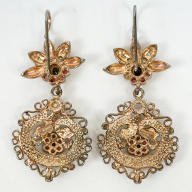 Paio di orecchini in argento dorato con microperle e pietre pregiate, lunghezza cm 5, peso lordo gr.17, (difetti)
