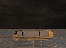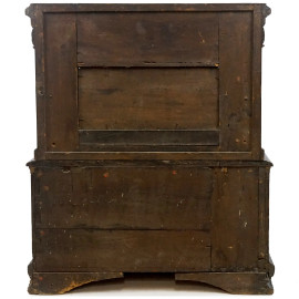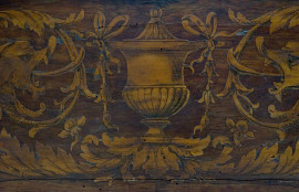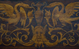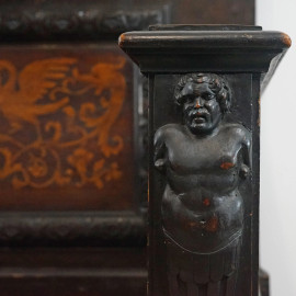 schienale, seduta e base riccamente intarsiati a motivo di grottesche, vasi e ramages, particolari scolpiti a foggia di mezzo-busti maschili.