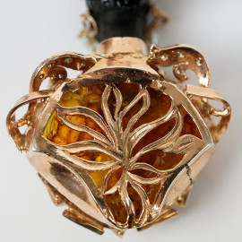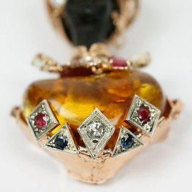 Pendente a forma di moretto in ebano e ambra, montato in oro 9 KT e impreziosito da brillantini, rubini, zaffiri, opali e perline semoventi alle orecchie, lunghezza cm 7,1