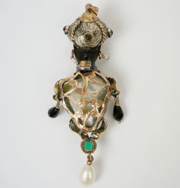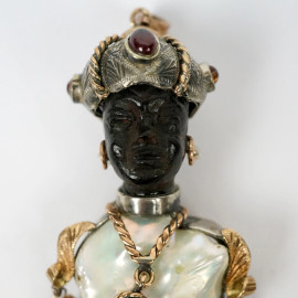 Pendente a forma di moretto in ebano, montato in oro 9 kt e argento, busto formato da perla barocca impreziosito da smeraldi e pietre nere, turbante finemente cesellato con rubini incastonati, perline semoventi alle orecchie, lunghezza cm 10