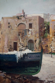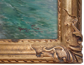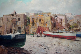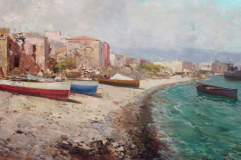 Veduta costiera, olio su tela, cm 51x102, entro cornice.