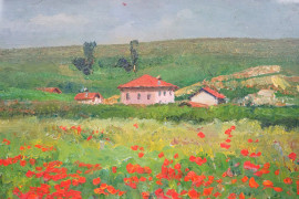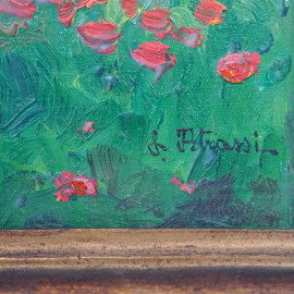 Paesaggio con papaveri, olio su tavola, cm 27x36, entro cornice