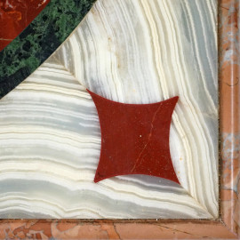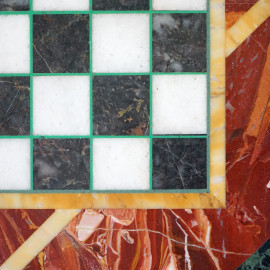 Piano rettangolare centrato da scacchiera con decori in commesso di marmi policromi, cm 53x53x3, (difetti).