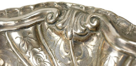 Piatto tondo in argento, inizi XX secolo, decori sbalzati a cesellati, diam cm 20, peso gr. 260