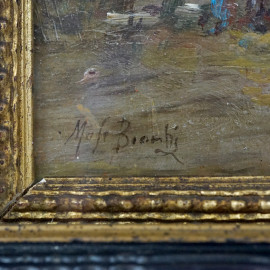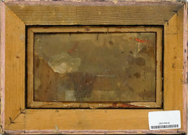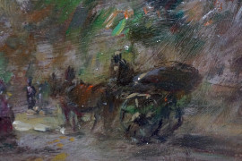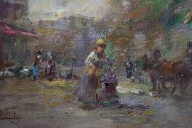 Piazza con carrozza e figure, olio su tavola, cm 12x22, firmato, entro cornice.