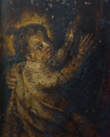 Pittore del XVII secolo, Madonna con Bambino, olio su rame, cm 23,5x17,5, entro cornice, (difetti, cadute di colore).
