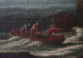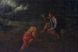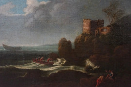 Pittore del XVIII secolo, Marina con pescatori, olio su tela, cm 39x56, (lievi difetti).