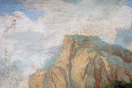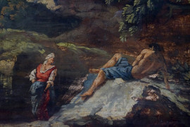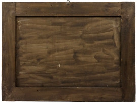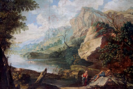 Pittore del XVIII-XIX secolo, Paesaggio con figure, olio su tela applicata su tavola, cm 48x73, entro cornice, (restauri)