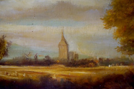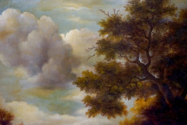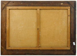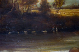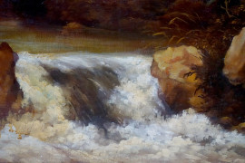 Pittore della fine del XIX secolo, Paesaggio con cascatella, olio su tela, cm 84x125, entro cornice, (lievi difetti).