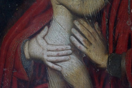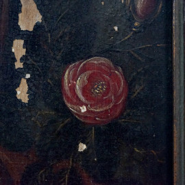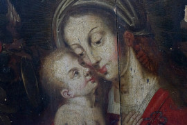 Pittore fiammingo del XVII secolo, Madonna col Bambino, olio su tavola, cm 64x49,5, entro cornice, (difetti)