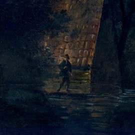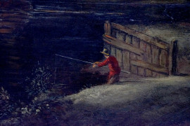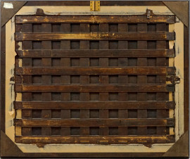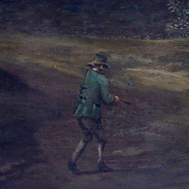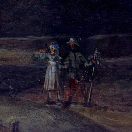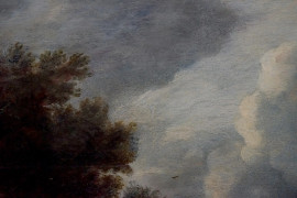 Pittore olandese del XVII secolo, Paesaggio con canale e figure, olio su tavola, cm 64x82, entro cornice
