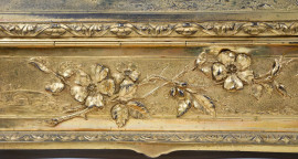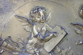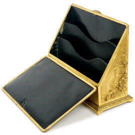 decoro raffigurante Cupido e coppia di uccellini su rami in fiore, interno a vari scomparti rivestito in pelle, cm 23x30x12,5, (difetti).