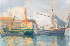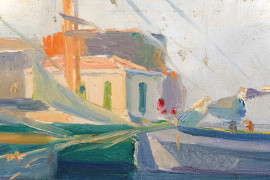Porticciolo, olio su cartone telato, cm 38x46, XX secolo, (difetti).