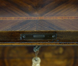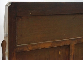 parte superiore con sportello a calatoia celante cassettini e vuoti all'interno, parte inferiore a due tiretti e tre cassetti, piedi a zampa di rapace con boccino, cm h 111x109,5x59, (difetti).