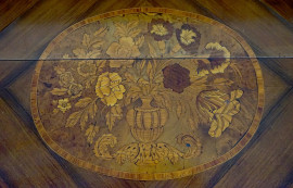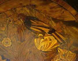 Ribalta olandese riccamente intarsiata a motivi floreali e di volatili su rami