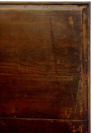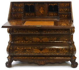 sportello superiore a calatoia celante cassettini e vuoti all'interno, fronte a quattro cassetti, ricchi intarsi a motivi di foggia di vasi, volute e volatili, piedi ad artiglio cm 109x110x62, (difetti).