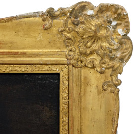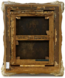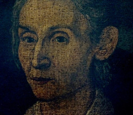Ritratto di anziana, antico dipinto ad olio su tela, cm 47x38, entro cornice, recante iscrizione sul retro del telaio, (difetti).