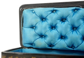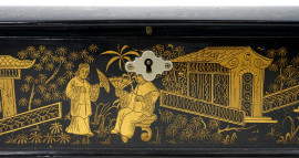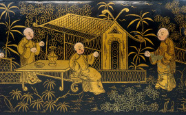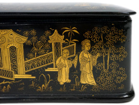 Scatola in legno laccato con decori orientali dorati raffiguranti scene di corte, cm h 6,5x29,5x8,5, Cina, XX secolo, (difetti).