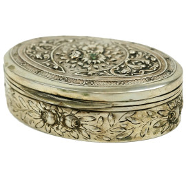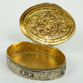 Scatola ovale in argento, XX secolo, con decori floreali incisi e cesellati, interno dorato, cm 2,5x9,5x7, peso gr. 92