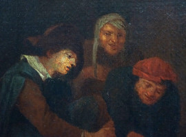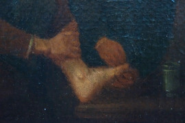 Scuola fiamminga del XVII secolo, Il medicamento, olio su tela, cm 28x34, entro cornice.