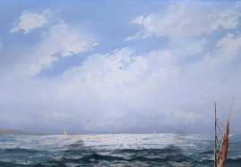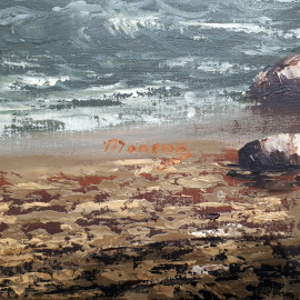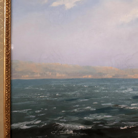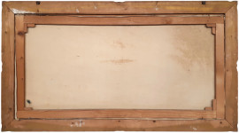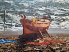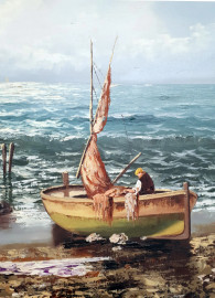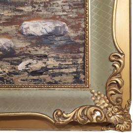 Scuola Napoletana del XX secolo, Marina con barche in secca sulla spiaggia, grande raffinato dipinto ad olio su tela, cm 60x120, firmato, con importante cornice in lacca verde e oro, prima metà del XX sec