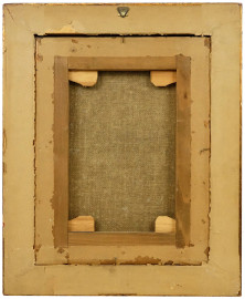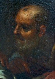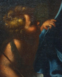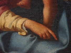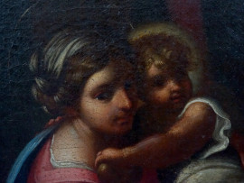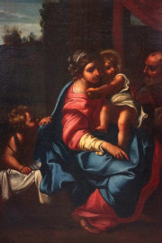 Seguace Annibale Carracci (1560-1609), Sacra Famiglia con S.Giovannino, olio su tela, cm 37,5x28, XVII secolo, entro cornice