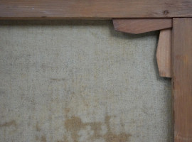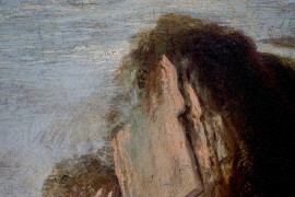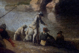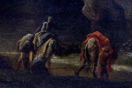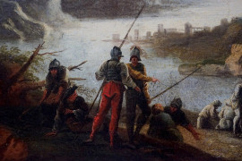 Seguace di Salvator Rosa (Arenella, 1615- Roma,1673), Paesaggio con cavalieri in riva al fiume, olio su tela, cm 51x90,5, entro cornice.