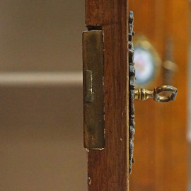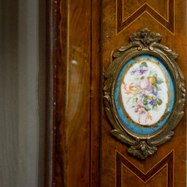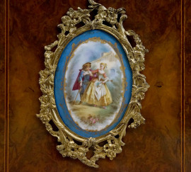 fronte ad uno sportello centrale e due laterali a vetri, placche in porcellana policroma decorata a mazzetti di fiori e scena galante, particolari di cariatidi e profili in bronzo dorato, cm 105x166x41, (difetti).