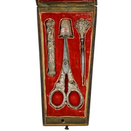 Set da cucito in argento, XIX secolo, entro custodia in legno intarsiato, cm 12,5x6,5x1,5, (difetti)