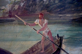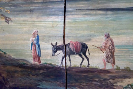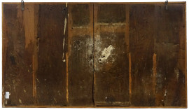 Sovrapporta in legno laccato e sagomato, XIX secolo, cornice modanata con scena centrale dipinta raffigurante il Passaggio durante la fuga in Egitto da Annibale Carracci (1560-1609), ingombro tot cm 90x160, (difetti).