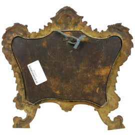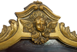 decori a motivi di foglie e volute, cimasa con testa di cherubino alato, piedini a ricciolo, cm h 32x34, (difetti).