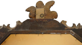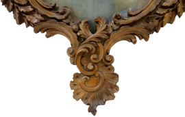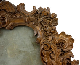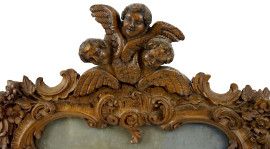 Specchiera di linea sagomata in legno intagliato a volute foglie e fiori, cimasa scolpita a tre teste di cherubini, ingombro tot. cm 139x92, XIX secolo, (difetti).