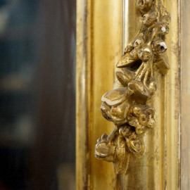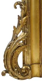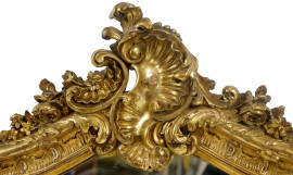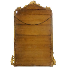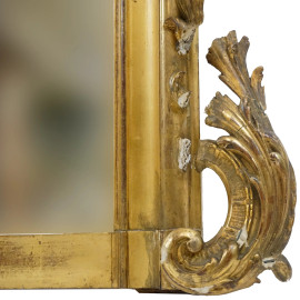 Specchiera di linea sagomata, inizi XX secolo, con cimasa intagliata a motivi di rocailles, ingombro cm 148x103, (lievi difetti).