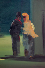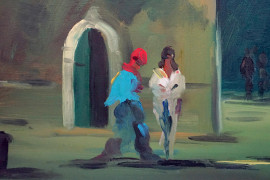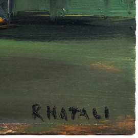 Strada con figure, olio su compensato, cm 30x40, firmato R. Natali, (lievi difetti).