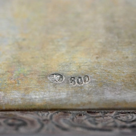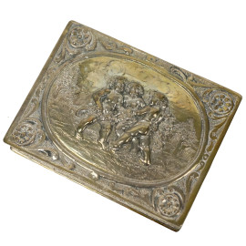 Tabacchiera in argento, inizi XX secolo, interamente cesellata, coperchio decorato con riserva ovale raffigurante paesaggio con putti, cm 8x6,5x1, peso gr. 90, (difetti).