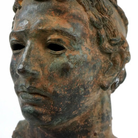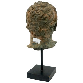 Testa virile, scultura in bronzo, cm h 41, XIX secolo, poggiante su base in legno.