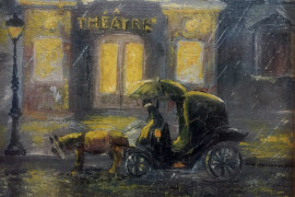 Theatre, olio su cartone telato, cm 10x10,5, XX secolo, entro cornice.