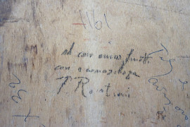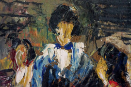Tre figure, olio su tavoletta, cm 23x15,5, XX secolo,(difetti)