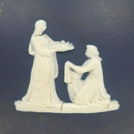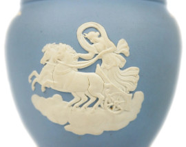 Tre oggetti in porcellana Wedgwood, XX secolo, decori a bassorilievo raffiguranti fanciulle ed il Carro di Diana, alt. max cm 10, (difetti).