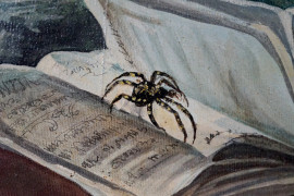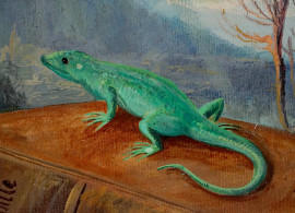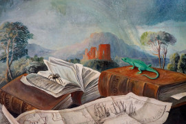 Trompe l'oeil con libri e ramarro, olio su tela, cm 50x70, XX secolo, entro cornice.