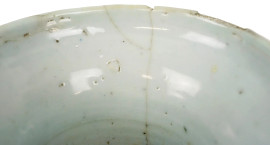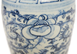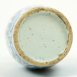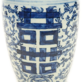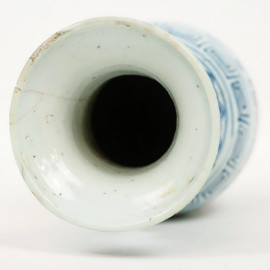 Vaso in porcellana bianco e blu, corpo e collo a decori geometrici e motivi floreali, Cina, XX secolo, cm h 24, (difetti e restauri sull'orlo)