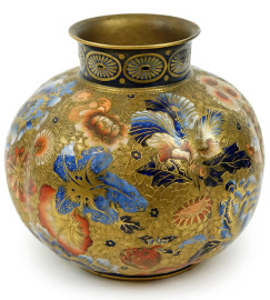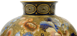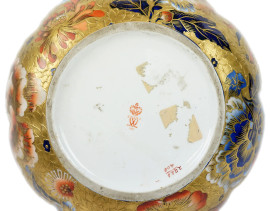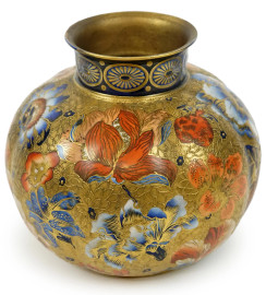 Vaso in porcellana con decori dorati e smalti policromi, cm h 17, marcato sotto al base, XX secolo.