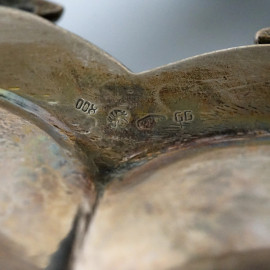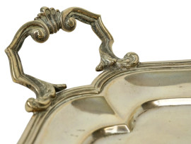 Vassoio in argento, inizi XX secolo, di linea sagomata con due prese laterali cesellate, cm 57x35,5, peso gr. 1339